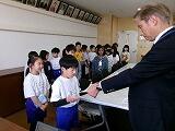 先週から学級委員任命式が行われました。3年生以上の学級委員が決まり,任命証を校長室で渡します。学級委員らしく立派な態度で立ち,任命証もしっかり受け取っていました。最後に自分の学級委員としての目標や意気込みを語ってもらいました。