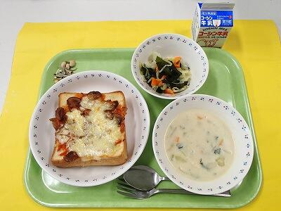 今日はピザトーストです。給食のピザトーストは、玉ねぎや
