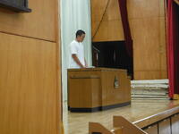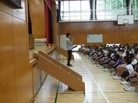 対面式,リモート形式,それぞれの目的のもとに行われていることは明らかですが,田中中78年目にして初めて行われた前後期制の切替えに際しては,対面式を採用しました。全校生徒が一堂に会し,1つのことに気持ちを向け合う対面式,終了後に教務主任が語り,その意義を伝えていました。今後も機会があれば,全校生徒が1つになる時間を,適宜取り入れてまいります。
