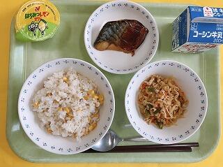 今日のご飯はもろこしご飯です。夏が旬のとうもろこしは、米や麦と同じくイネ科の植物で、世界3大穀物のひとつです。糖質、タンパク質が多く、とても重要なエネルギー源です。今日はとうもろこしと、もち米を昆布を入れてふっくらと炊き上げました。