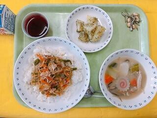 今日はししゃもをぎょうざの皮でくるんでパリパリになるように揚げました。ししゃもが苦手‥という子も食べやすくなっていると思います。頭からたべられるのでカルシウムが豊富です。たぬき汁は精進料理としても有名で、肉の代わりにさつま揚げを入れて食べたのが始まりといわれています。