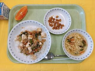 今日は豆腐をたくさん使って麻婆豆腐丼を作りました。豆腐は植物性のたんぱく質が豊富で、身体を丈夫にする働きがあります。かきたま汁は卵がふわふわになるように仕上げています。でこぽんは今が旬のオレンジで、果実が甘くジューシーです。今日もみなさんよく食べてくれていました。