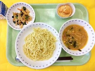 今日は味噌ラーメンです。大豆や豚肉をたくさん使って作っているのでたんぱく質が豊富です。丈夫な身体を作るのにタンパク質が必須です。マフィンには柏市産の米粉を使用しています。ふっくらと仕上がりました。