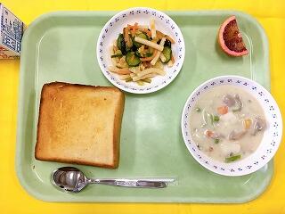 今日は、パンにハチミツとレモンを混ぜ合わせたものをぬって焼き上げました。レモンの風味がほんのりと香っていると思います。シチューには柏市でとれたカブを使用しています。米粉で仕上げているので、なめらかな味わいです。また、今日の果物はブラッドオレンジです。その名の通り、赤い果肉が特徴的です。「このオレンジ初めてみた!」と言っている生徒もちらほらいました。アントシアニンが含まれているため、抗酸化作用があります。