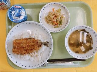 今日は鰯に片栗粉をまぶしてカラッと揚げました。白いご飯の上にのせました。鰯にはビタミンDが豊富に含まれており、カルシウムの吸収率を高めるといわれています。強い骨を作るために、残さず食べてもらいたいと思います。