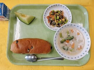 今日はエビとひよこ豆を入れたクリームシチューです。ルウは小麦粉とバターから手作りしています。メロンは千葉県産のものです。地元の旬な果物を味わいましょう。