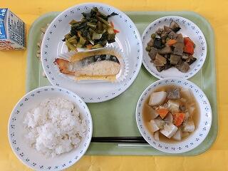 今日は鮭にみそ味で下味をつけ、チーズをのせて焼きました。鮭にはアスタキサンチンという色素が含まれており、抗酸化作用があります。いもの子汁は、岩手県の郷土料理です。里芋やこんにゃくなど、具たくさんです。