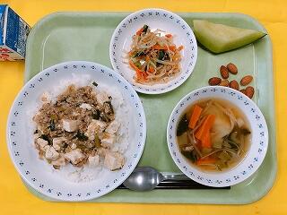 今日は大豆と豚肉を入れトマトソースの味付けにしました。大豆がたくさん入っているのでたんぱく質が豊富にとれるメニューです。チョコチップスコーンは生徒の皆さんに人気のあるデザートです。給食室で小麦粉から手作りしています。