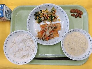 今日はいかを片栗粉でまぶして揚げ、しめじと玉ねぎ、にんじんのマリネを合わせました。マリネはからしやレモン汁でさっぱりとした味付けになっています。