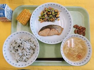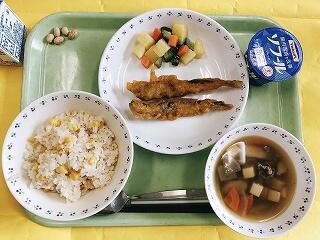 今日はししゃもにカレー粉をまぶして揚げました。暑い日にも食欲がすすむようなメニューとなっています。もろこしご飯はもち米とあわせて炊いていますのでおこわのような食感に仕上がっています。
