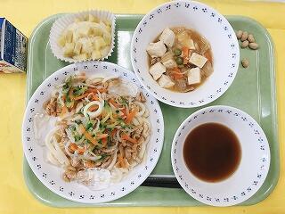 今日はうどんに氷を入れ冷やしたうどんです。じめじめとした今の時期でもさっぱり食べやすいメニューです。さつまいも蒸しパンは、小麦粉に豆乳や砂糖を混ぜ、給食室で蒸しました。甘さが控えめで作っているので、さつまいもの素材を味わうことができます。