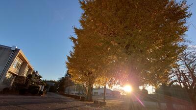 12月6日(金) 12月に入り、朝夕は冷え込むこともありますが、日中はまだまだ暖かい日が続いています。校庭のイチョウの木もきれいに黄葉してきましたので、そろそろ大量に舞い落ちるころです。下の写真は、今朝生徒が登校する前、朝日に照らされるイチョウの木の様子です。