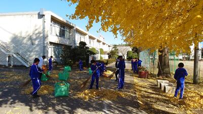 そして、午前中の授業が終了すると、地面は一面黄色のじゅうたんとなりました。昼休み、予定されていた落ち葉掃きには、有志の生徒が大勢集まってくれました。イチョウの木は、秋の深まりとともに、その見事な黄葉は私たちの目を楽しませてくれます。しかし、落ち葉の片づけは本当に大変です!!。呼びかけに進んで参加してくれた生徒とともに、晩秋の昼下がり、季節の移り変わりを感じることができました。