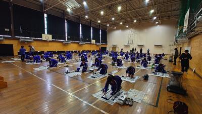 1月7日(火) 今日から、令和7年(2025年)の学校生活が始まりました。全校集会後の体育館では、毎年恒例の校内席書大会が行われました。席書大会は、全校生徒が一堂に会して書き初めができる、本校ならではの行事です。どの生徒も一筆に集中して書き上げた、自分の力作を提出していました。