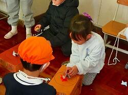 当日は,地域の皆様15名が来校してくださり,あやとり・羽子板・おはじき・お手玉・コマ・けん玉・竹とんぼ・竹馬など,さまざまな昔遊びを教えていただきました。