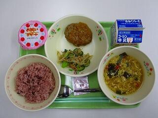 給食も卒業をお祝いしてのメニューです。牛乳・お赤飯・たまねぎたれかけハンバーグ・チンゲン菜のからしあえ・にらいりかき玉汁・お祝いいちごジュレです。