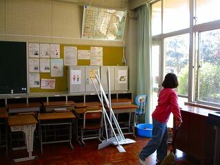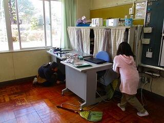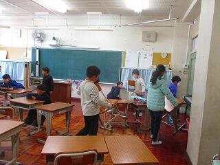 2年生は,6年生の教室の掃除担当です。机を移動させて隅々までぞうきんがけをしています。ピカピカの教室にして,5年生に飾り付けをしてもらいます。