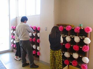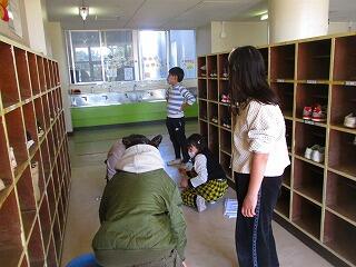 体育館の作業がどんどん進んでいます。6年生の昇降口をきれいに飾った4年生は,6年生の保護者の方が使う体育館の靴箱を飾り付けていきます。