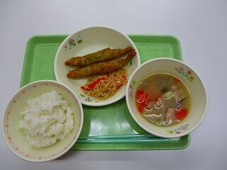 掃除の後は,給食です。6年生は,小学校生活最後の給食です。牛乳・ご飯・ししゃもの磯辺揚げ・切り干し大根のうまに・豚汁です。