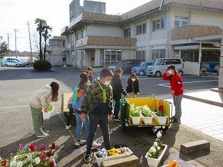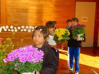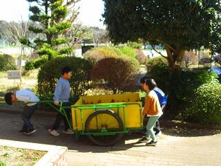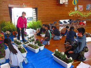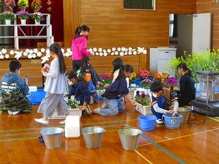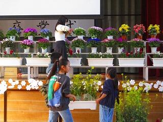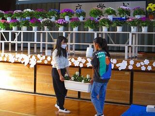 学校で育てた花をリヤカーで体育館に運びます。体育館では,プランターをきれいに拭いていきます。