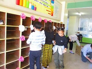 昇降口では,6年生の靴箱をきれいに飾り付けていきます。