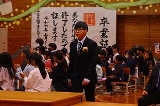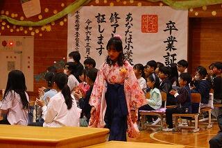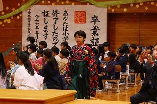 6年生を見送ります。在校生の拍手の中,未来に向けての新しい一歩を踏み出します。