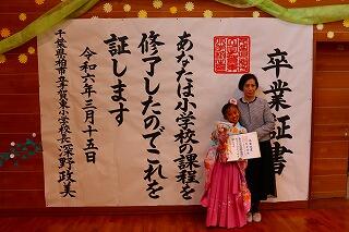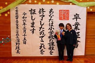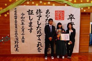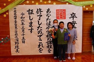 手賀東小学校の書写講師、綾部先生がジャンボ卒業証書を書いてくださいました。見送りの後も記念撮影が続きます。