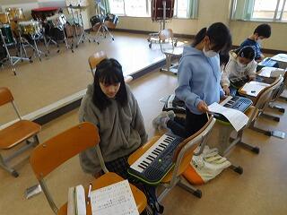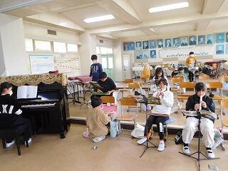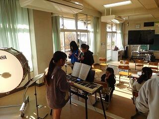 リコーダー、鍵盤ハーモニカ、キーボード、ピアノ、小太鼓、大太鼓などの楽器に分かれて、2グループで演奏します。