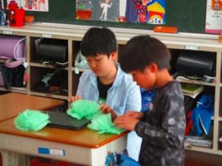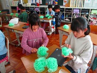6年生を送る会の準備が進んでいます。3年生の教室では,花のアーチのお花作りです。