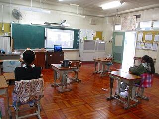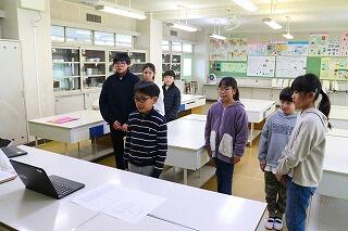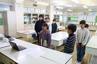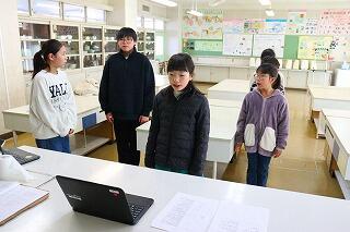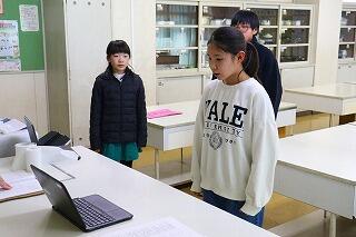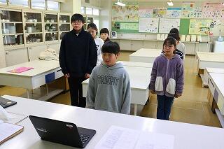 昼休みに児童会引き継ぎ式を家庭科室で行いました。GoogleMeetで家庭科室と教室をつなぎオンラインで行いました。始まる前につながっているかの確認をしています。「聞こえたら手を挙げてくだい」の声に元気に手を挙げています。