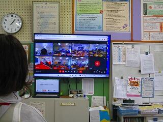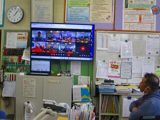 担任以外の職員は,職員室で引き継ぎ式の様子見ました。