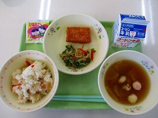 掃除の後は,給食です。6年生は,小学校生活最後の給食です。牛乳・ご飯・ししゃもの磯辺揚げ・切り干し大根のうまに・豚汁です。