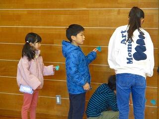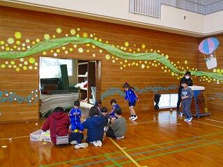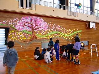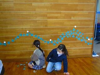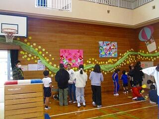 体育館の床がきれいになり,1.2時間目に1年生~5年生が壁の装飾を行いました。