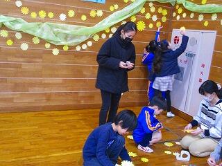 体育館の作業がどんどん進んでいます。6年生の昇降口をきれいに飾った4年生は,6年生の保護者の方が使う体育館の靴箱を飾り付けていきます。