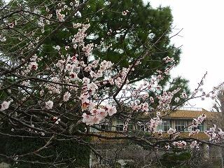 今日は,朝から曇り空でした。校庭の桜の木に花が咲いています。寒い日が続いていますが,春が来ています。