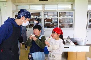 蒸したては,おいしいです。給食前ですが,嬉しそうに自分で作ったばらっぱまんじゅうを食べています。