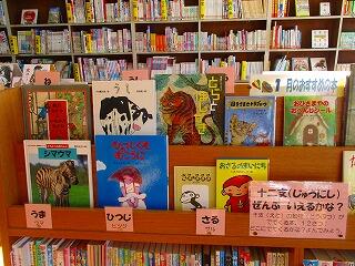 『十二支 ぜんぶ いえるかな?』のコーナーには,干支の動物が出てくる本が紹介されています。12冊以上並ぶときもあります。