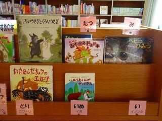 【い】のコーナーがあいています。どんな本だったのかしら? 【さる】は2冊本が並んでいます。同じ“さる”でも作家の方によって違う猿です。