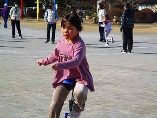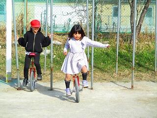 始める前は,緊張している子供たちです。一輪車をこぎ始めるとみんなどの子も真剣な表情です。