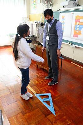 今回は、大きな定規や分度器を用意し、子供自身が動いて考えさせました。