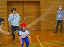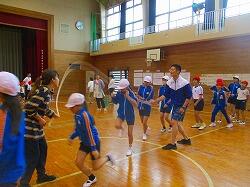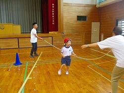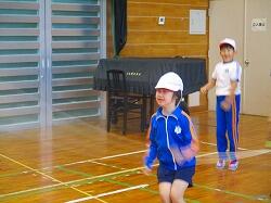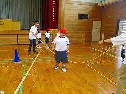 1年生は,回っている縄を通り抜けるところから始めました。2年生は,ゆっくりですが回っている縄をよく見て跳んでいます。