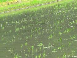 みんなが植えた苗です。大きく育つといいですね。田んぼの前を通るときには,今日植えた苗に向かって優しい言葉をかけると大きく育ちますよ。