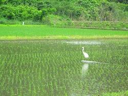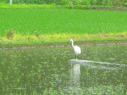 白い鳥が田んぼの中を歩いています。子供たちが植えた苗の間も優雅に歩いていました。