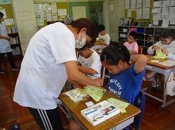 読み読み教室では,授業が始まる前から1年生が卯月先生のもとへ集まり,楽しそうに話しかける姿が見られました。卯月先生もニコニコと優しく応えてくださり,人懐っこい1年生たちとの温かいやりとりが印象的でした。