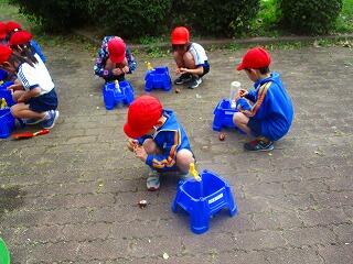 植木鉢に土を入れました。「虫がいるよ」「その虫は,いい虫なんだよ。」「虫がいたらいやだから,虫のいない土を入れよう」「虫がいる土は,いい土なんだよ。」と自分の思いを友達に伝えながら活動しました。