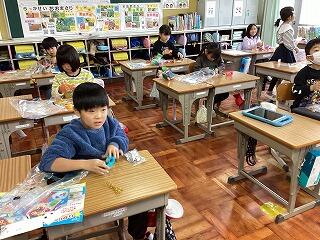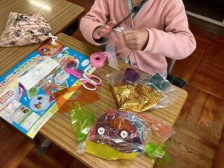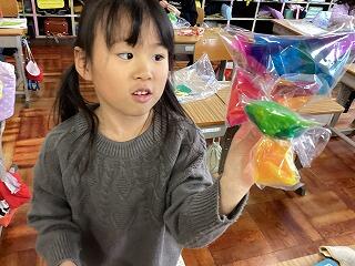 今日の図工は,「ひかりのくにのなかまたち」ということで,透明な袋に色セロファンを入れて,色や形を工夫しながら自分の作りたい物を作りました。