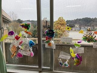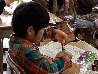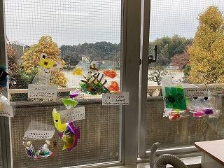 初めから作りたい物に向けて工夫する子もいれば,作りながら「〇〇みたいだ。」と思いつき,「じゃあこうしよう。」と工夫する子もいました。完成後,窓に飾ると光が通り,更に素敵な作品に見えました。