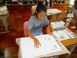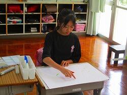何色を使ってもよい。指は汚れたらふく。楽しい気持ちを表現する。暗い気持ちの人は気持ちをチェンジして楽しく描くというお話を聞いてから作品作りに取り組みました。