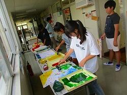 画用紙に模様を付けた後は,廊下で作業しました。好きな色の版画インクを選んで,ローラーを使い画用紙にインクをのせます。模様をつけて,次のインクをのせ乾く前に模様をつけます。