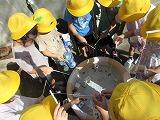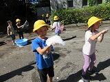 夏休みに自分で作った道具を使って、しゃぼん玉や水遊びをしました。